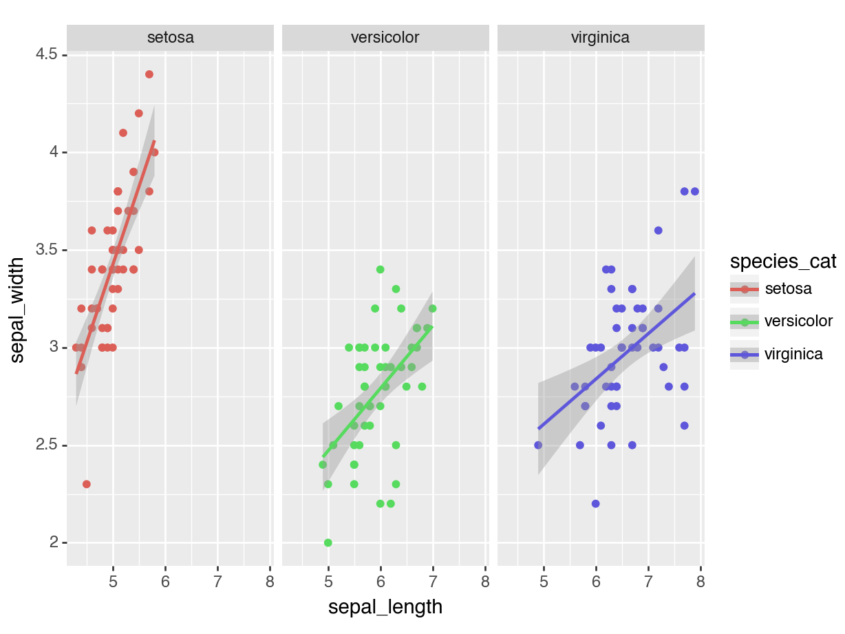 ggplot(aes(x = "sepal_length", y = "sepal_width", color = "species_cat")) +