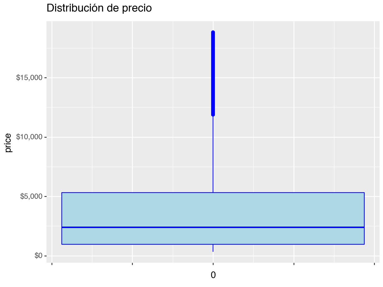 geom_boxplot(aes(x = 0, y = "price"), color= "blue", fill= "lightblue") +