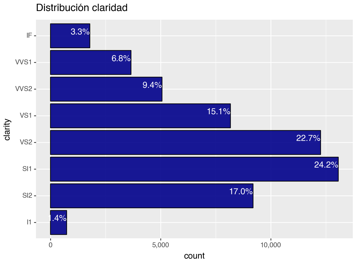 - clarity: una medida de la claridad del diamante (I1 (peor), SI2, SI1, VS2, VS1, VVS2, VVS1, IF (mejor))