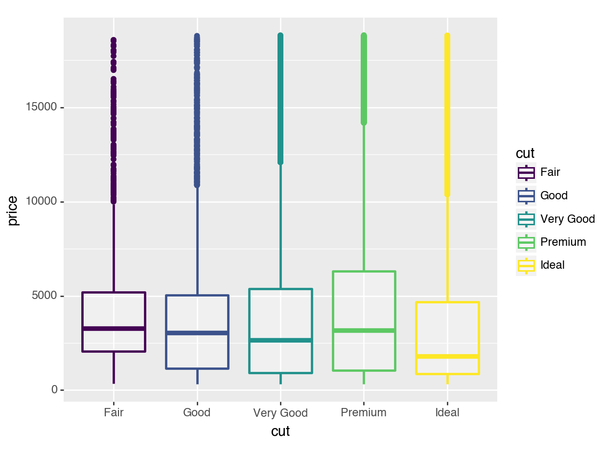 ggplot(aes(y = "price", x = "cut", color = "cut")) +