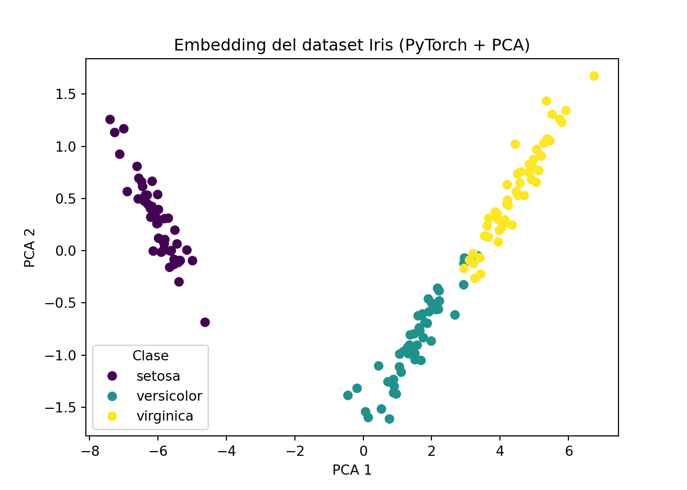 ## Text(0.5, 1.0, 'Embedding del dataset Iris (PyTorch + PCA)')
