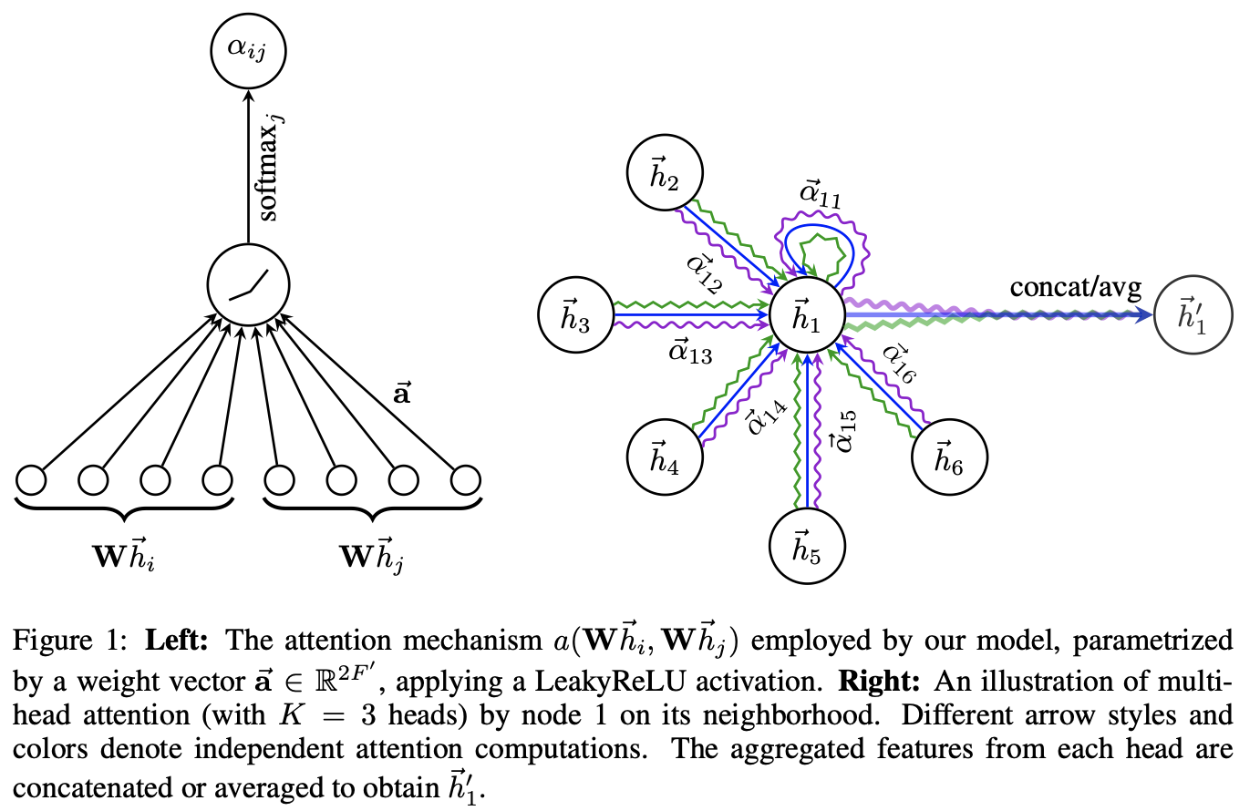 \[\begin{equation} \alpha_{ij} = \frac{\exp\left(\text{LeakyReLU}\left(\mathbf{a}\left[\mathbf{W}h_i||\mathbf{W}h_j\right]\right)\right)}{\sum_{k\in\mathcal{N}_i} \exp\left(\text{LeakyReLU}\left(\mathbf{a}\left[\mathbf{W}h_i||\mathbf{W}h_k\right]\right)\right)} \end{equation}\]