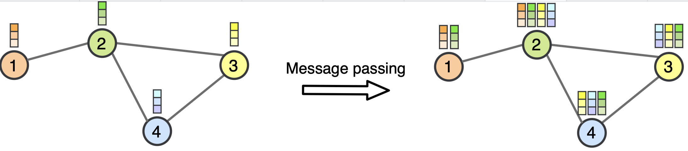 Esto generaliza en algún sentido la acción de las redes convolucionales que procesan imagenes, pero en vez de deslizar una ventana cuadrada (filtro) sobre píxeles, los nodos “interrogan” a sus vecinos.