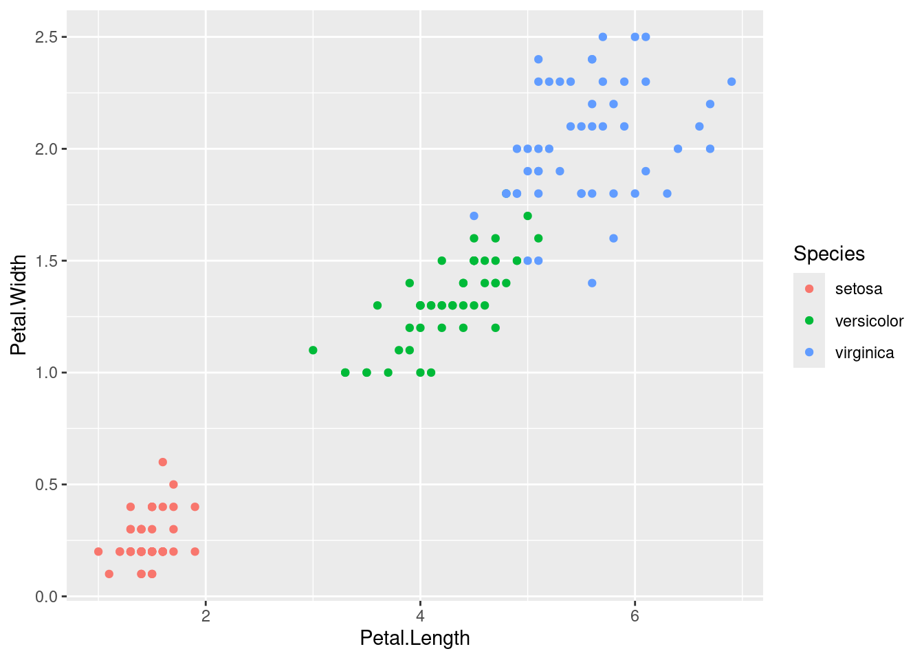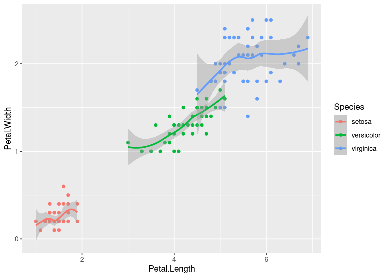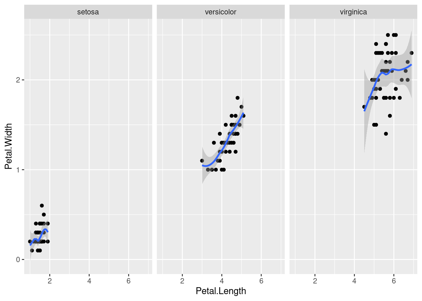 crea tres gráficos dispuestos horizontalmente que comparan la relación entre la anchura y la longitud del pétalo de las tres especies de iris. Una característica de estos gráficos, que es crítica para poder hacer comparaciones adecuadas, es que comparten ejes.