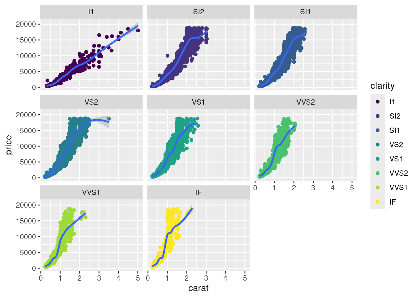 Muchos de los gráficos que pueden generarse con los elementos anteriores pueden reproducirse usando los gráficos tradicionales de R, pero no los que usan facetas, que pueden permitirnos explorar las variables de diferente forma, por ejemplo: